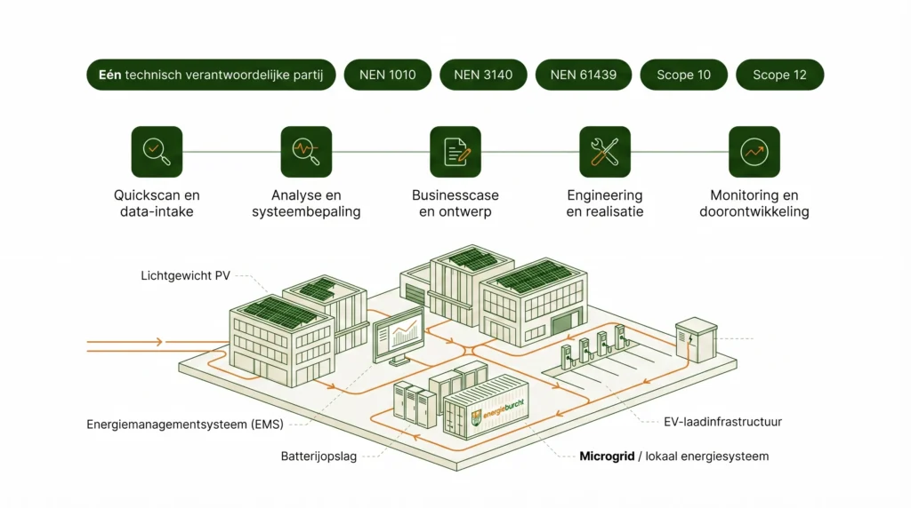 Wij van Energieburcht leveren één integraal traject: inspectie en ontwerp, constructieve en elektrotechnische toetsing, realisatie en inbedrijfstelling. Oplevering met volledig dossier, Scope 10/12-keuring en NEN-conformiteit voor verzekerbaarheidsacceptatie. Zo nemen wij risico en regeldruk weg, zodat jij operationele ruimte houdt en bouwt aan een zekere, eigen energietoekomst.