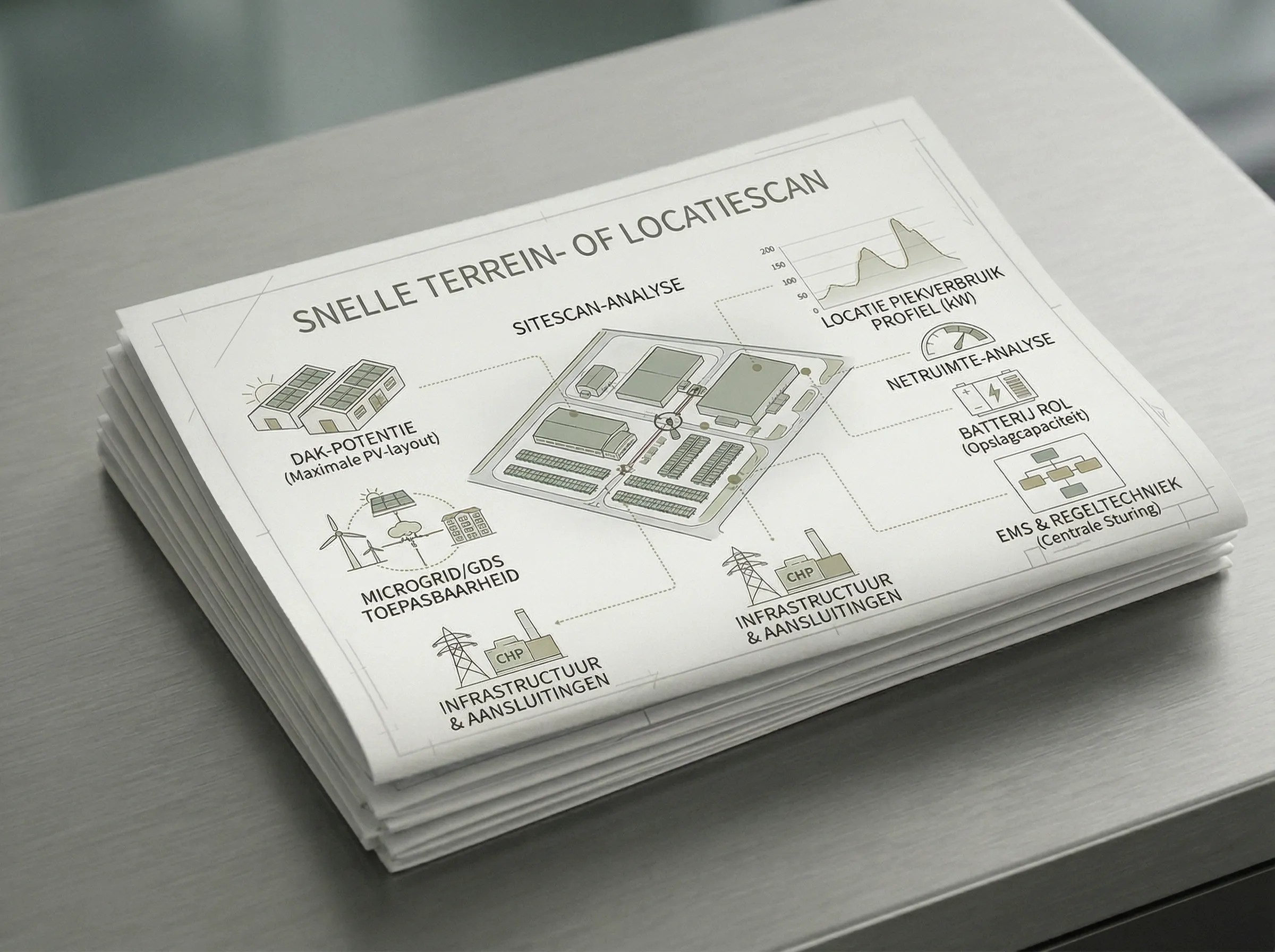 Op bedrijventerreinen en industriële locaties komen productie, HVAC, procesinstallaties, laadinfra, opwek, opslag en verdeelinrichting vaak tegelijk samen. Juist daarom kijken wij niet alleen naar losse assets, maar naar het hele systeem: aansluiting, meetdata, pieken, infrastructuur en de technische route naar uitbreiding.
