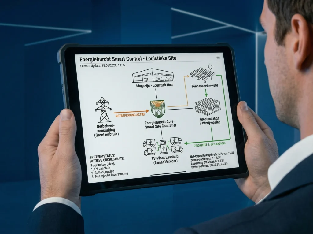 Bij logistieke locaties draait de energievraag zelden om één asset. Laden van trucks of bestelwagens, koelinstallaties, HVAC, intern transport en overige bedrijfsprocessen kunnen tegelijk pieken veroorzaken. Daardoor lijkt het probleem vaak groter dan het in werkelijkheid hoeft te zijn.