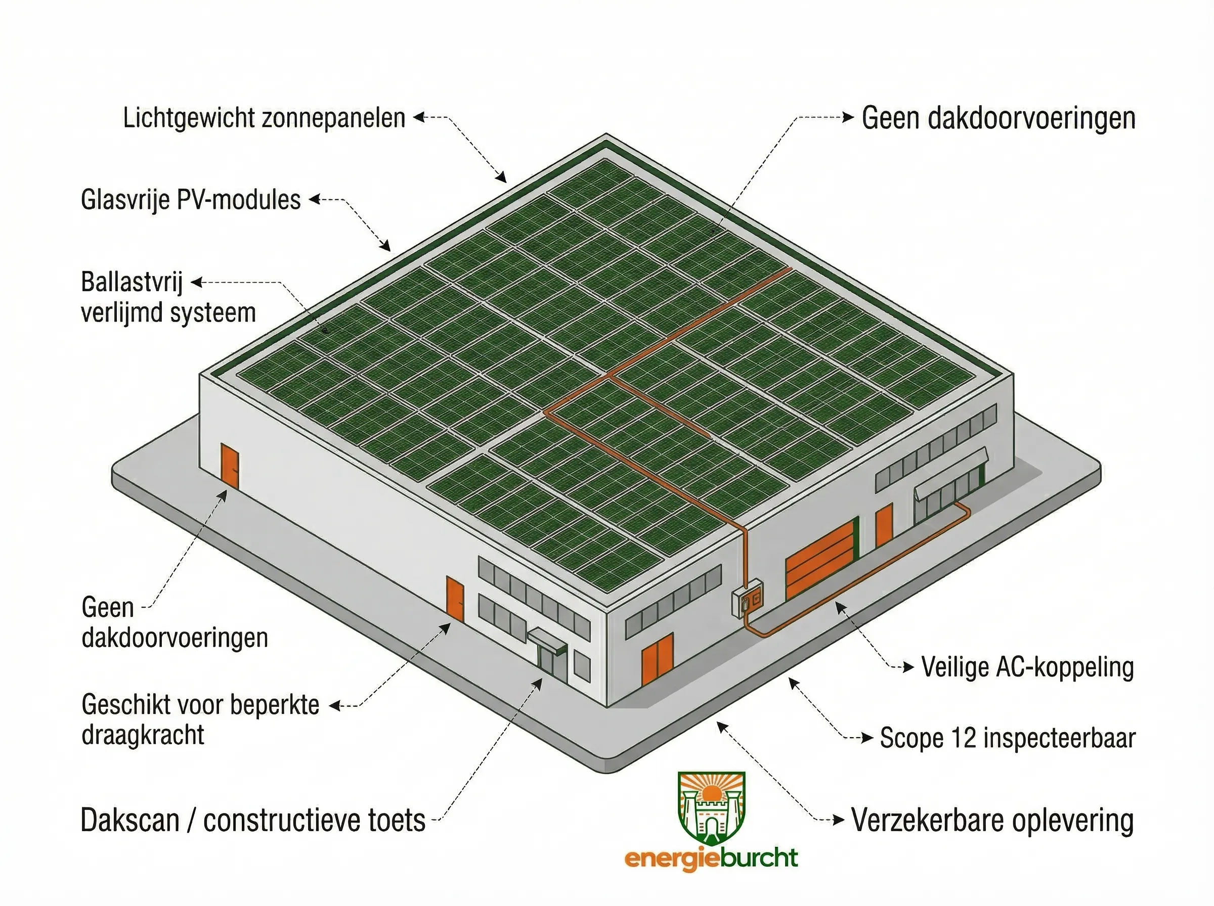 Niet elk bedrijfsdak is geschikt voor een standaard PV-opstelling met zware ballast en dakdoorvoeringen. Energieburcht maakt juist die daken juist bruikbaar met ultralichte, glasvrije PV-modules en een ballastvrij verlijmd systeem. Zo ontstaat lokale opwek op daken waar traditionele zonnepanelen vaak te zwaar of te risicovol zijn. We leveren het complete traject: van dakscan en constructieve toets tot engineering, opleverkeuring en documentatie voor beheer, inspectie en verzekeraar.